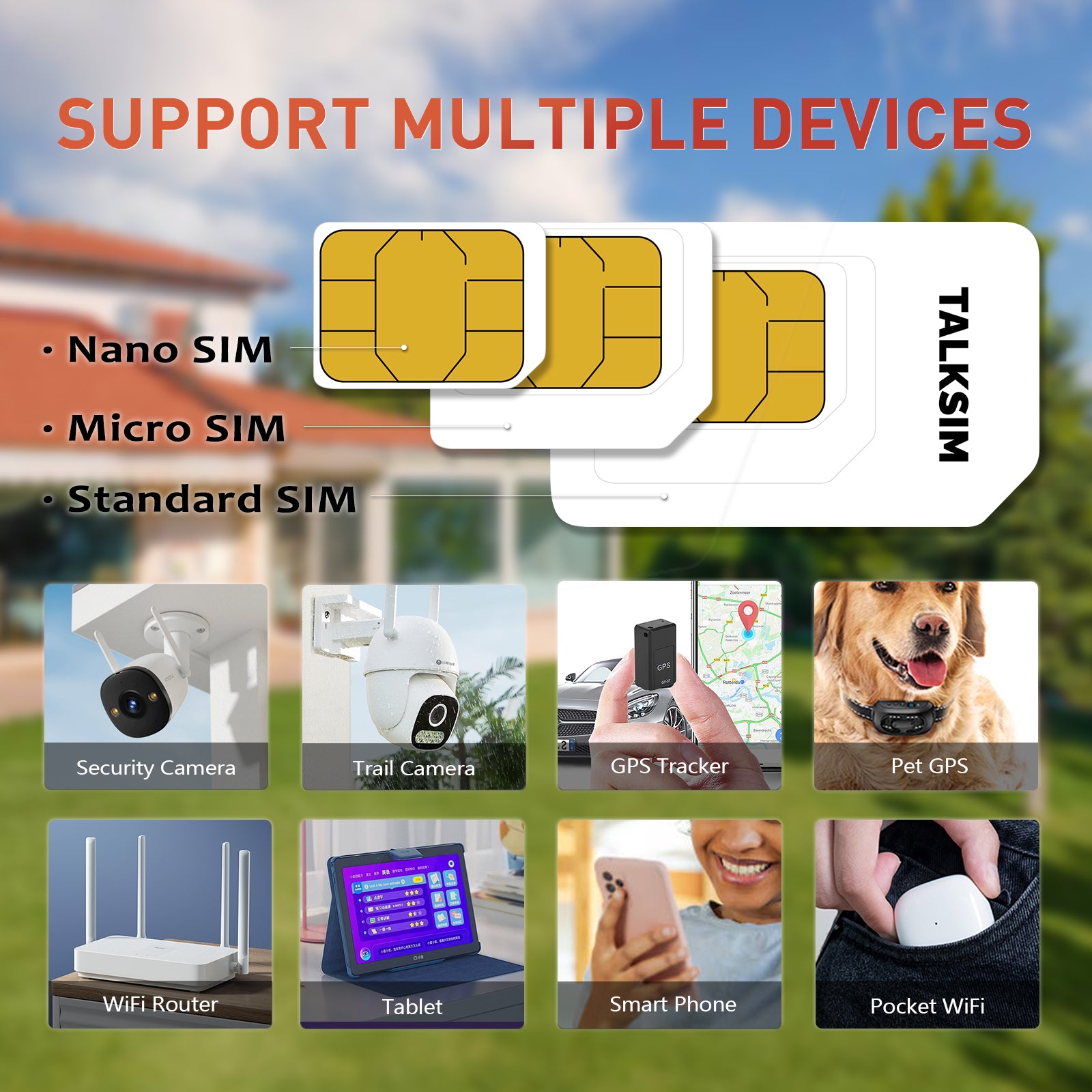 - Fit Unlocked 4G loT Devices:TALKSIM SIM card can be used for a lot of 4G devices, such as solar security camera, WiFi router, mobile hotspot, pocket WiFi, hunting camera, walkie talkie, 4G bird feeder and GPS pet/car tracker, etc.